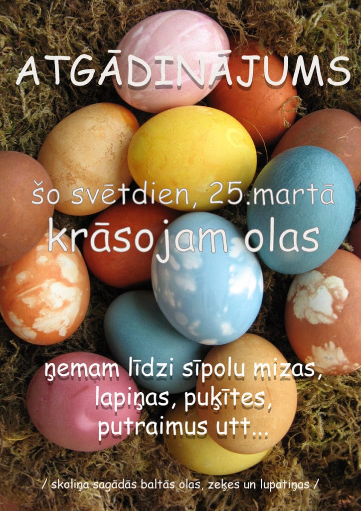 Šajā reizē visi ņemam līdzi svētku noskaņojumu!!!! Turpinot ilggadējo visiem iemīļoto tradīciju, krāsosim Lieldienu olas un skolas dienas beigās tās ripināsim.